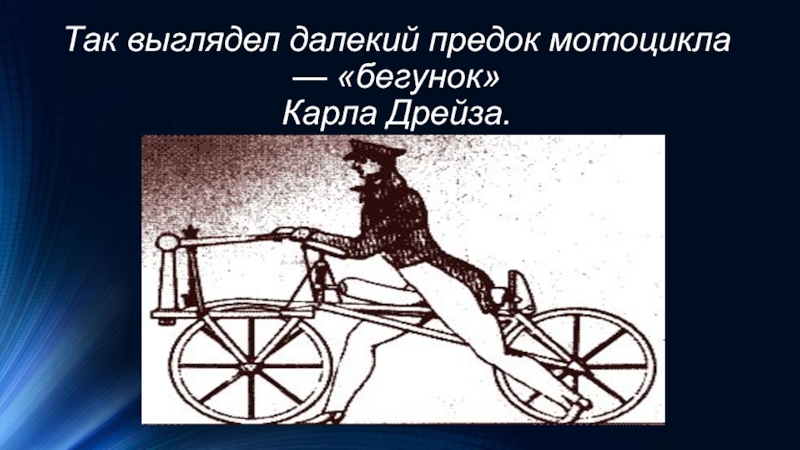 Слайд 13Так выглядел далекий предок мотоцикла — «бегунок» Карла Дрейза.