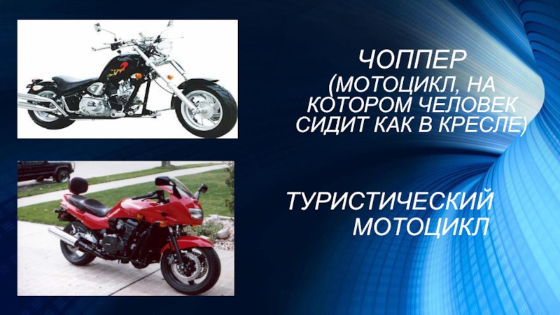 Слайд 25ЧОППЕР (МОТОЦИКЛ, НА КОТОРОМ ЧЕЛОВЕК СИДИТ КАК В КРЕСЛЕ)