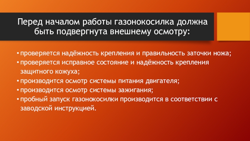 Слайд 11Перед началом работы газонокосилка должна быть подвергнута внешнему осмотру:
