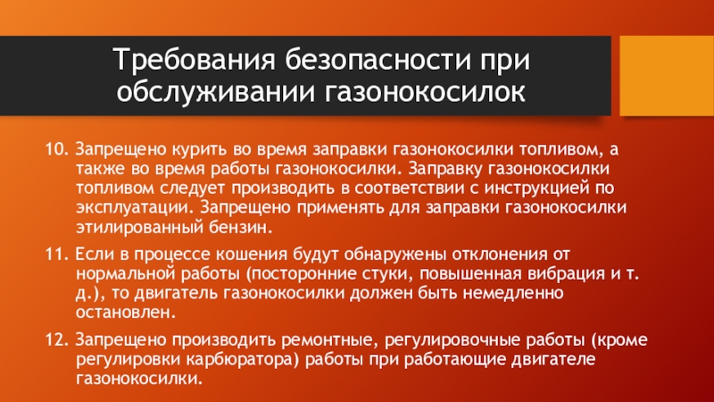 12. Запрещено производить ремонтные, регулировочные работы (кроме регулировки карбюратора) работы при работающие двигателе газонокосилки.