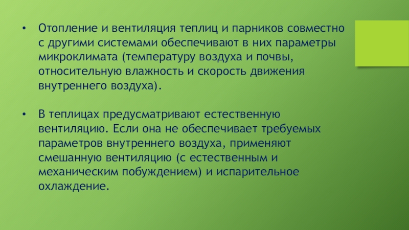 Слайд 53Отопление и вентиляция теплиц и парников совместно с другими системами обеспечивают