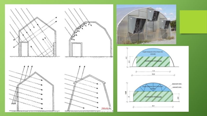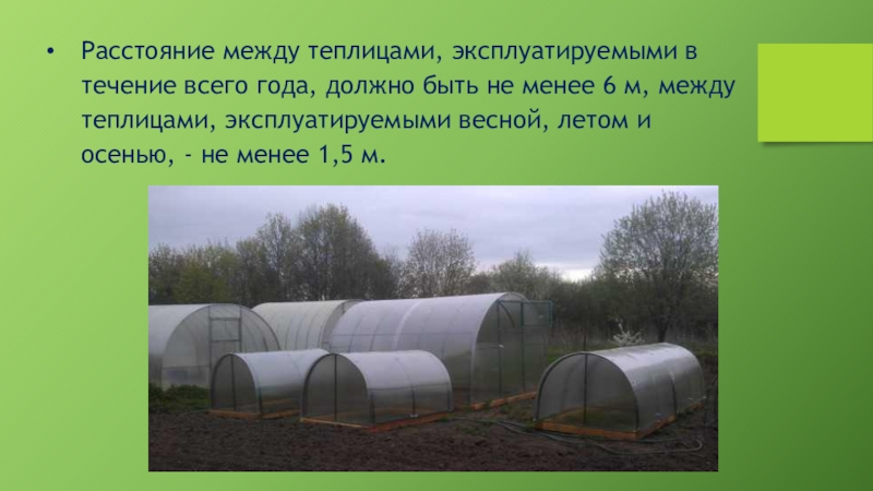 Слайд 47Расстояние между теплицами, эксплуатируемыми в течение всего года, должно быть не