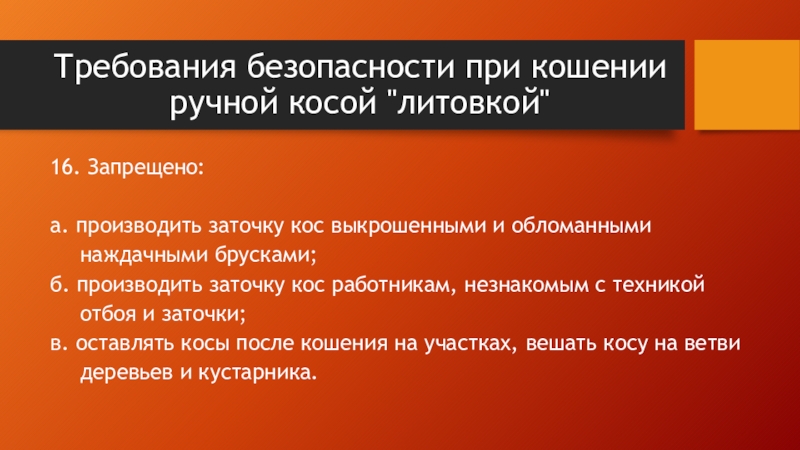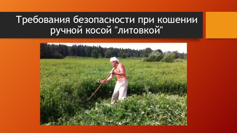 Слайд 19Требования безопасности при кошении ручной косой "литовкой"