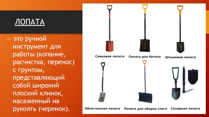 ― это ручной инструмент для работы (копание, расчистка, перенос) с грунтом,