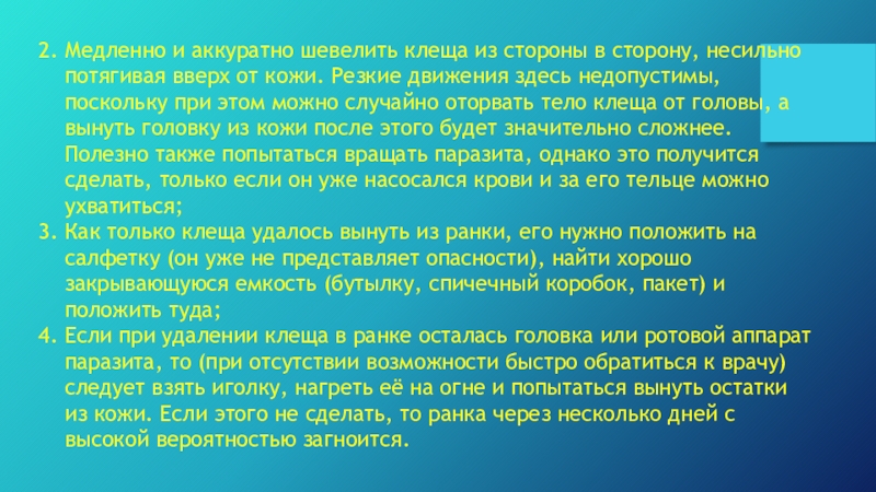 Слайд 372. Медленно и аккуратно шевелить клеща из стороны в сторону, несильно