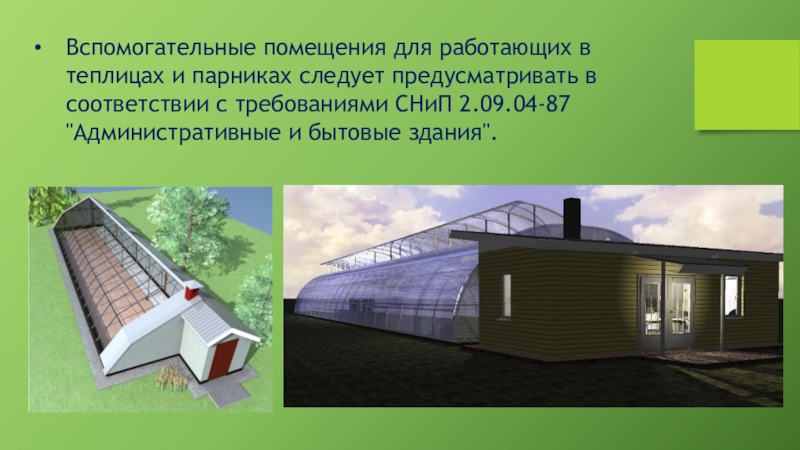 Слайд 50Вспомогательные помещения для работающих в теплицах и парниках следует предусматривать в