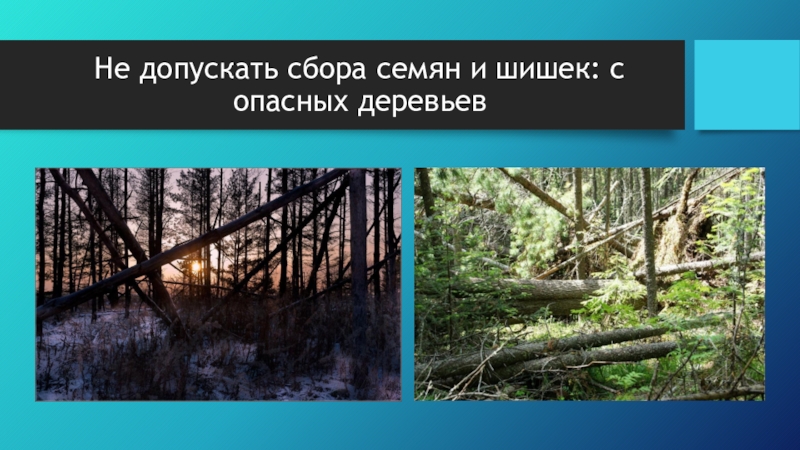 Слайд 29Не допускать сбора семян и шишек: с опасных деревьев
