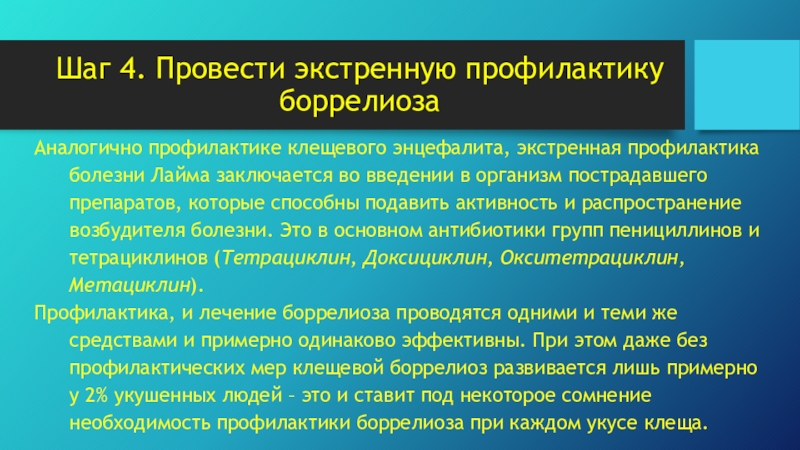 Слайд 41Шаг 4. Провести экстренную профилактику боррелиоза