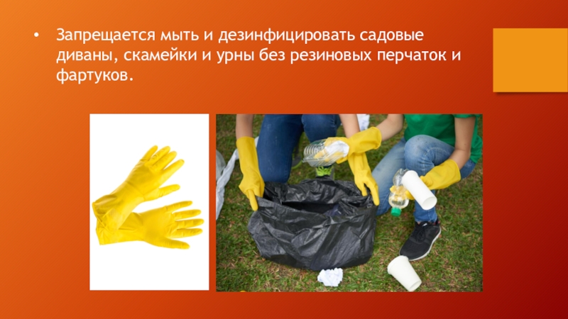 Слайд 63Запрещается мыть и дезинфицировать садовые диваны, скамейки и урны без резиновых