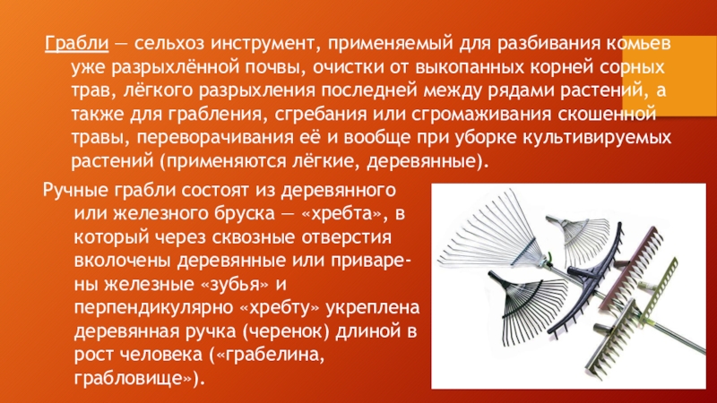 Слайд 61 Грабли — сельхоз инструмент, применяемый для разбивания комьев уже разрыхлённой почвы, очистки от