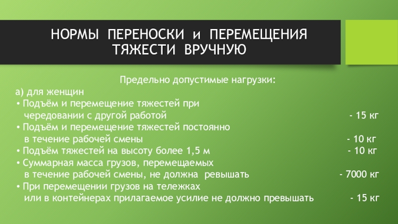 Слайд 4НОРМЫ ПЕРЕНОСКИ и ПЕРЕМЕЩЕНИЯ ТЯЖЕСТИ ВРУЧНУЮ