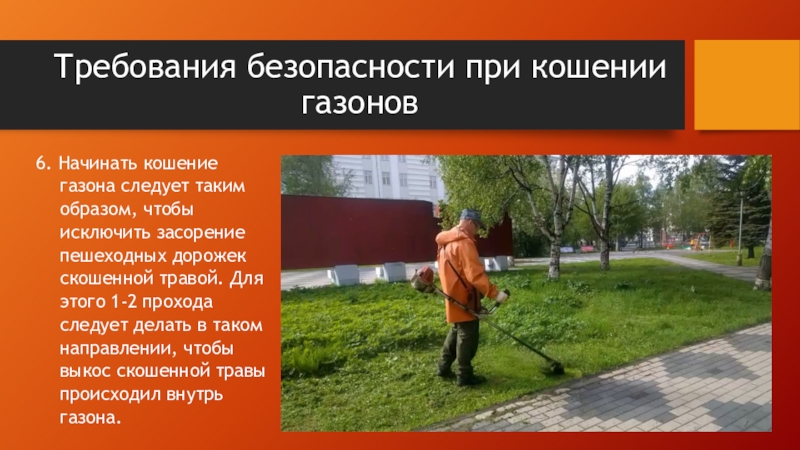 Слайд 146. Начинать кошение газона следует таким образом, чтобы исключить засорение пешеходных