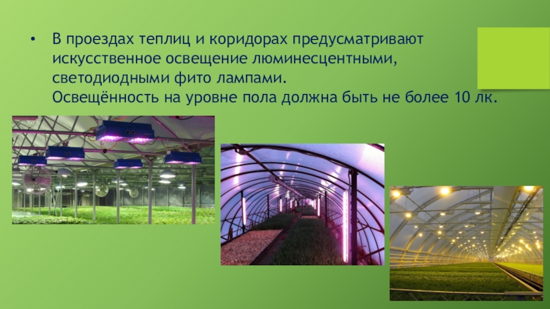 Слайд 56В проездах теплиц и коридорах предусматривают искусственное освещение люминесцентными, светодиодными фито