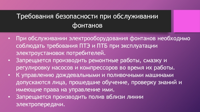 Слайд 44Требования безопасности при обслуживании фонтанов