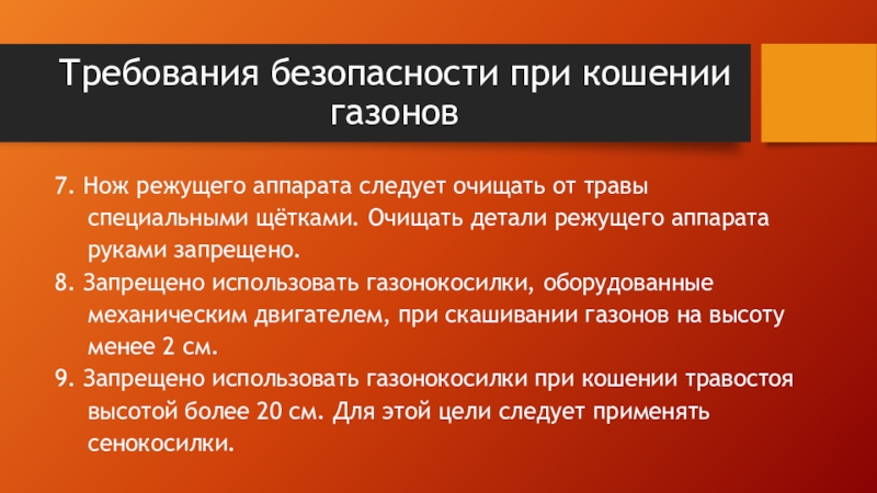 8. Запрещено использовать газонокосилки, оборудованные механическим двигателем, при скашивании газонов на высоту менее 2 см.