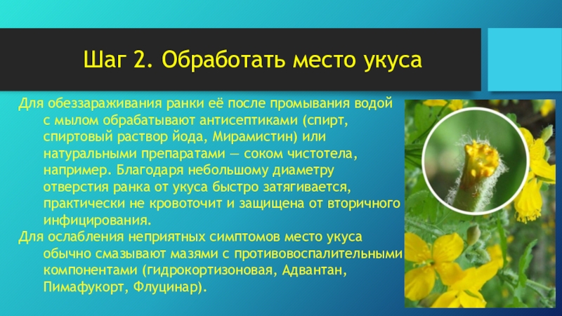 с мылом обрабатывают антисептиками (спирт, спиртовый раствор йода, Мирамистин) или натуральными препаратами — соком чистотела, например. Благодаря небольшому диаметру отверстия ранка от укуса быстро затягивается, практически не кровоточит и защищена от вторичного инфицирования.
