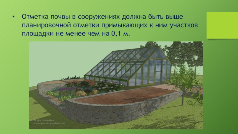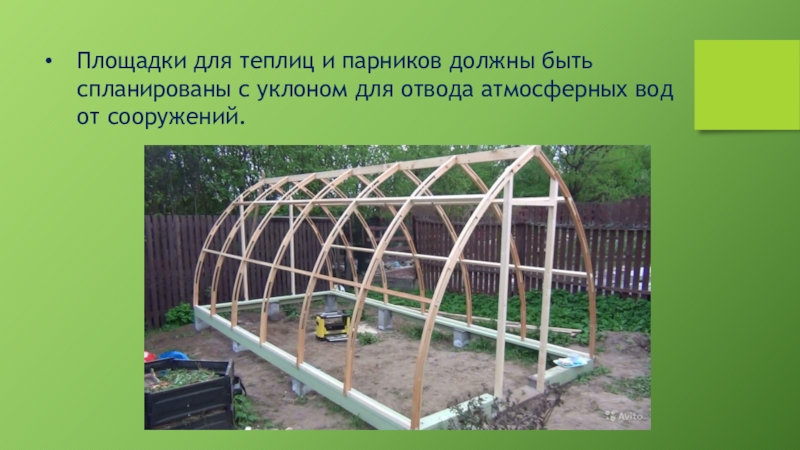 Слайд 48Площадки для теплиц и парников должны быть спланированы с уклоном для