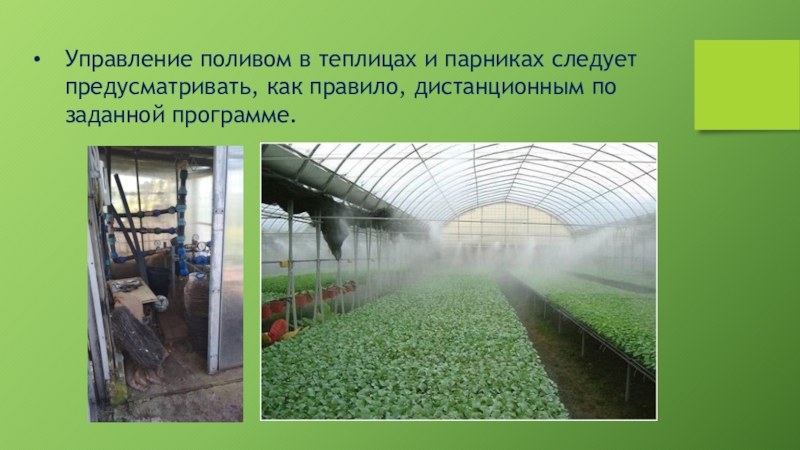 Слайд 52Управление поливом в теплицах и парниках следует предусматривать, как правило, дистанционным