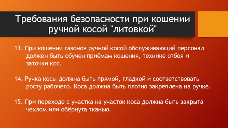 Слайд 1813. При кошении газонов ручной косой обслуживающий персонал должен быть обучен