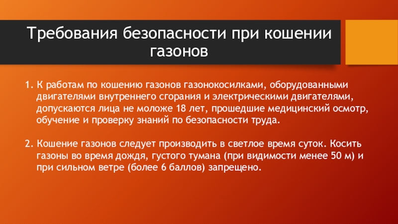 2. Кошение газонов следует производить в светлое время суток. Косить газоны во время дождя, густого тумана (при видимости менее 50 м) и при сильном ветре (более 6 баллов) запрещено.