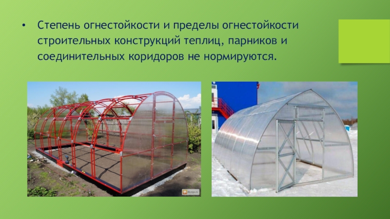 Слайд 46Степень огнестойкости и пределы огнестойкости строительных конструкций теплиц, парников и соединительных
