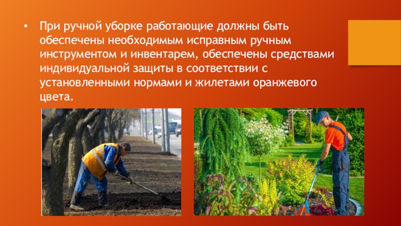 Слайд 58При ручной уборке работающие должны быть обеспечены необходимым исправным ручным инструментом