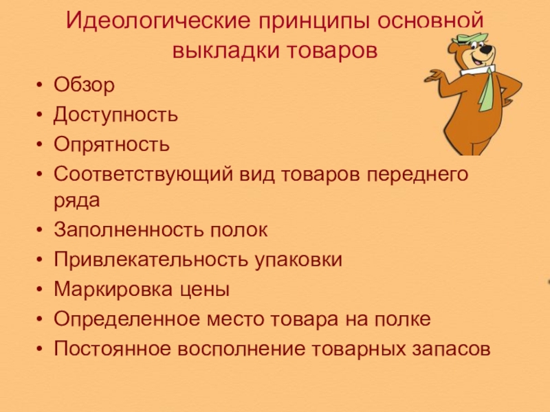 Слайд 30Идеологические принципы основной выкладки товаров