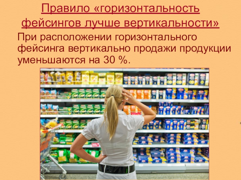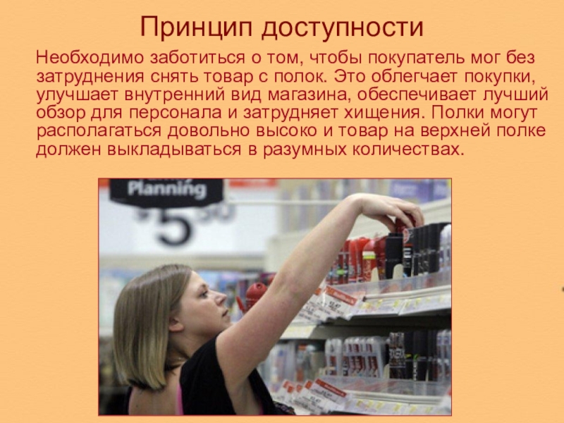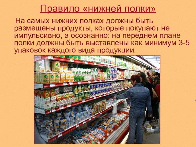 затруднения снять товар с полок. Это облегчает покупки, улучшает внутренний вид магазина, обеспечивает лучший обзор для персонала и затрудняет хищения. Полки могут располагаться довольно высоко и товар на верхней полке должен выкладываться в разумных количествах.