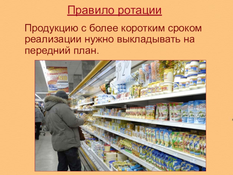 срок реализации, всегда должен находиться ближе к покупателю, чем товар с большим сроком. При выкладке новой партии товара нужно обязательно проверять сроки годности, оставшейся на полках продукции.