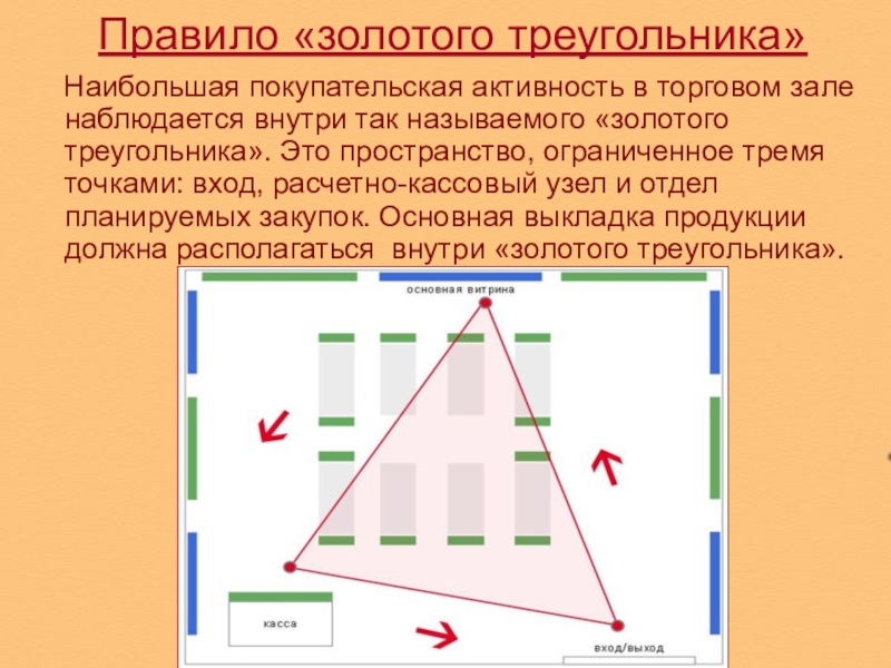 внутри так называемого «золотого треугольника». Это пространство, ограниченное тремя точками: вход, расчетно-кассовый узел и отдел планируемых закупок. Основная выкладка продукции должна располагаться внутри «золотого треугольника».