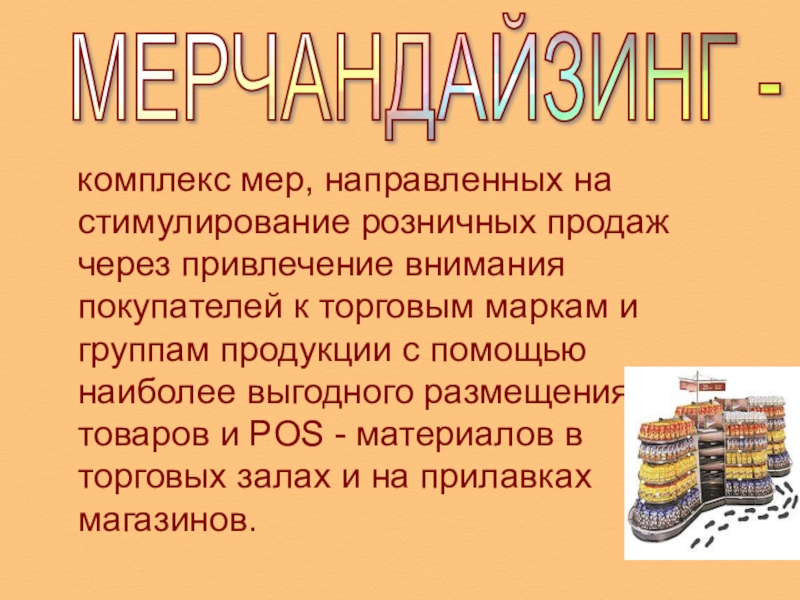Слайд 4Мерчандайзинг, или мерчендайзинг (от англ.merchandising), - часть процесса маркетинга, определяющая методику