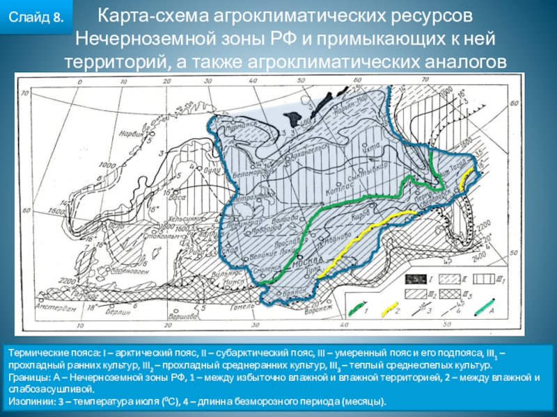 Изолинии: 3 – температура июля (0С), 4 – длинна безморозного периода (месяцы).