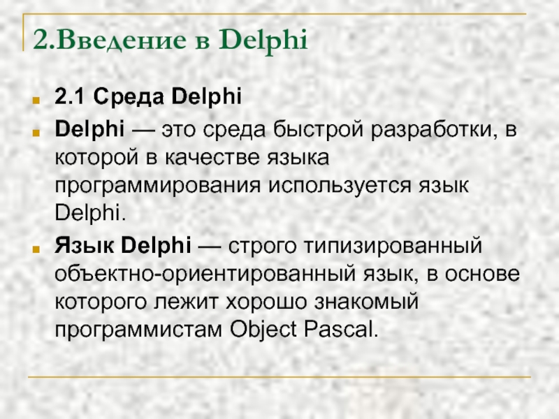 Язык Delphi — строго типизированный объектно-ориентированный язык, в основе которого лежит хорошо знакомый программистам Object Pascal.
