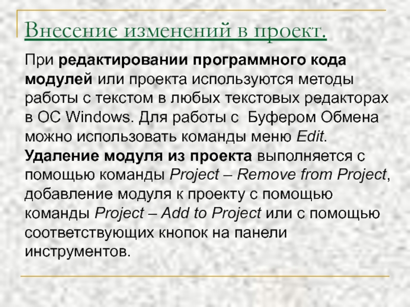 Удаление модуля из проекта выполняется с помощью команды Project – Remove from Projeсt, добавление модуля к проекту с помощью команды Project – Add to Project или с помощью соответствующих кнопок на панели инструментов.