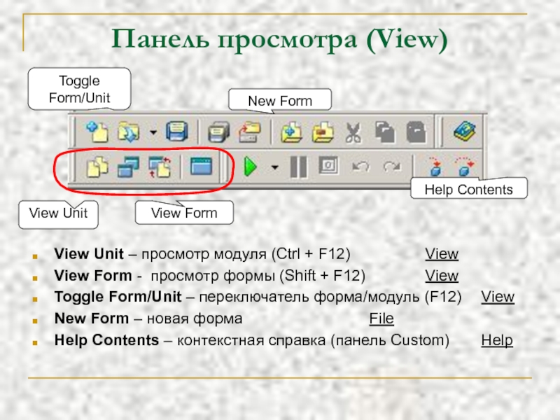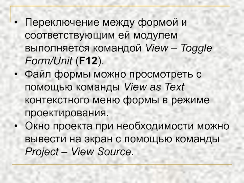 Слайд 26Переключение между формой и соответствующим ей модулем выполняется командой View –