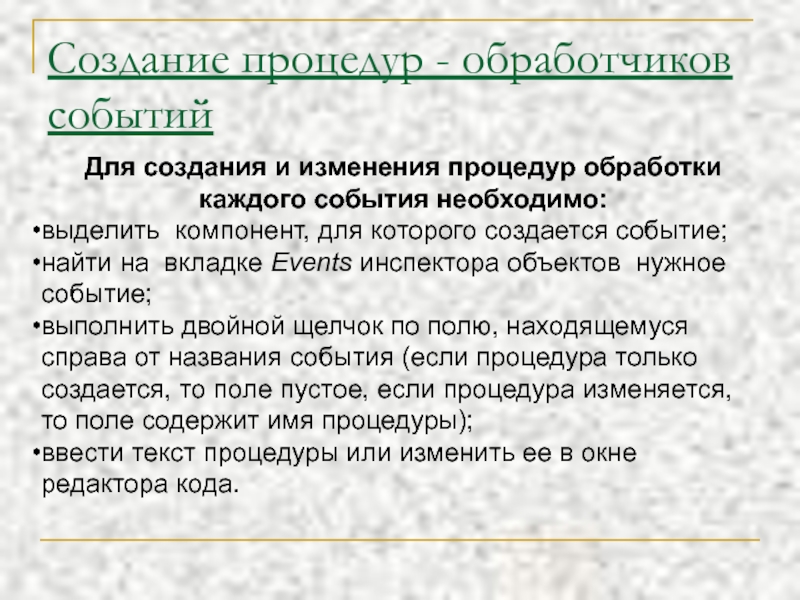 выполнить двойной щелчок по полю, находящемуся справа от названия события (если процедура только создается, то поле пустое, если процедура изменяется, то поле содержит имя процедуры);