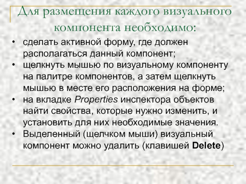 Слайд 30Для размещения каждого визуального компонента необходимо: