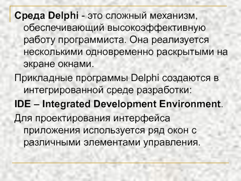 Слайд 6Среда Delphi - это сложный механизм, обеспечивающий высокоэффективную работу программиста. Она
