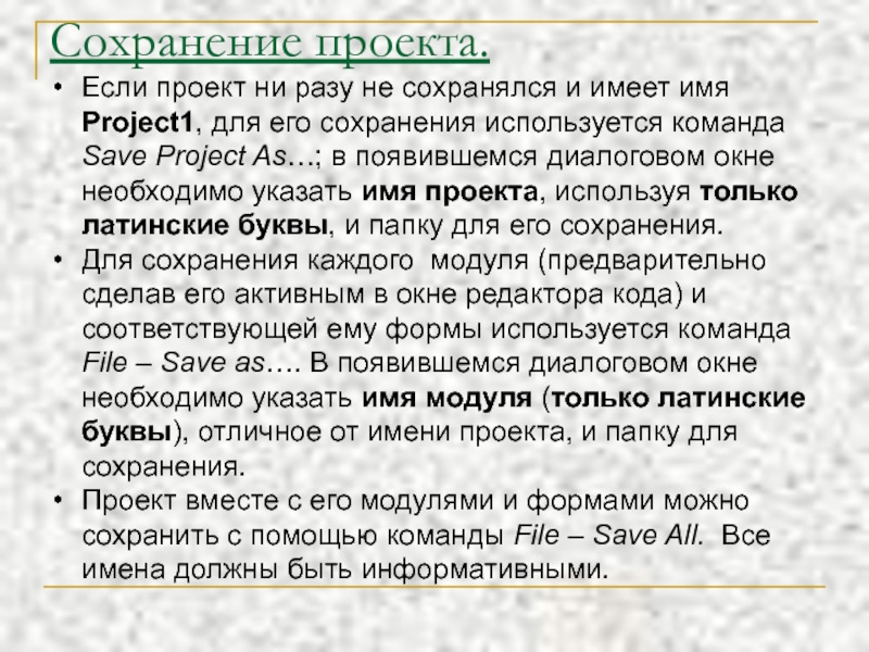 Проект вместе с его модулями и формами можно сохранить с помощью команды File – Save All. Все имена должны быть информативными.