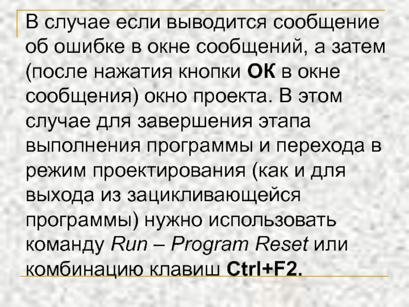 затем (после нажатия кнопки ОК в окне сообщения) окно проекта. В этом случае для завершения этапа выполнения программы и перехода в режим проектирования (как и для выхода из зацикливающейся программы) нужно использовать команду Run – Program Reset или комбинацию клавиш Ctrl+F2.