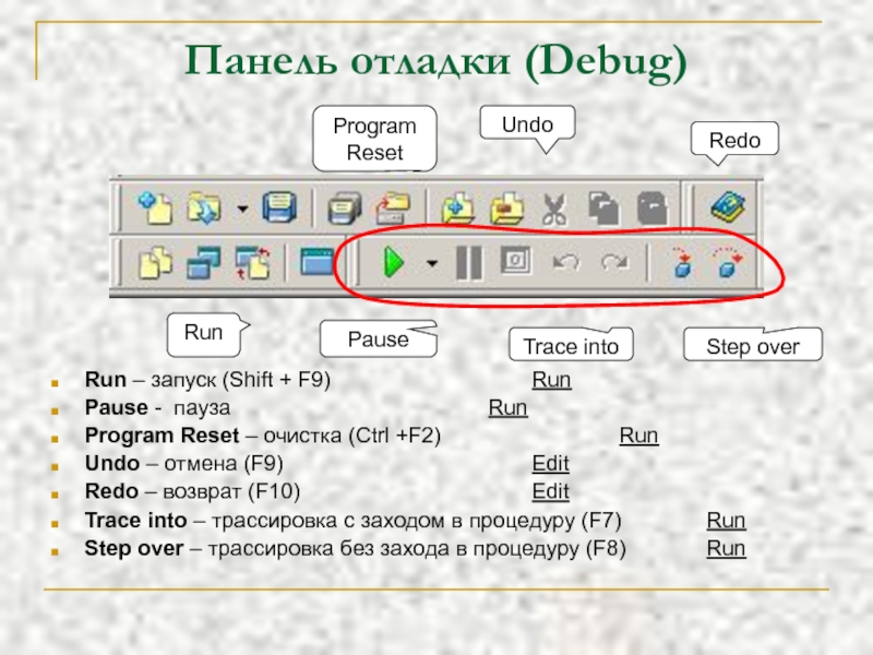 Trace into – трассировка с заходом в процедуру (F7) Run