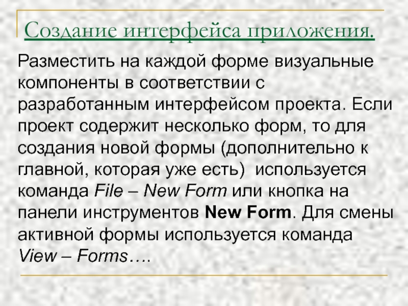 разработанным интерфейсом проекта. Если проект содержит несколько форм, то для создания новой формы (дополнительно к главной, которая уже есть) используется команда File – New Form или кнопка на панели инструментов New Form. Для смены активной формы используется команда View – Forms….