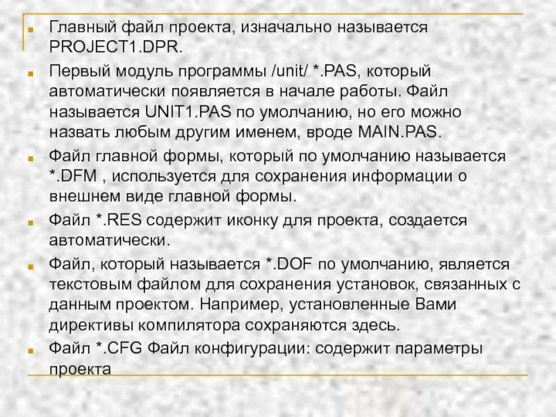 Слайд 9Главный файл проекта, изначально называется PROJECT1.DPR.
