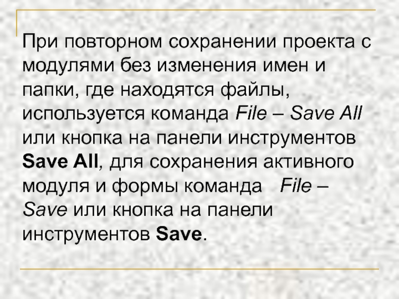 Слайд 32При повторном сохранении проекта с модулями без изменения имен и папки,