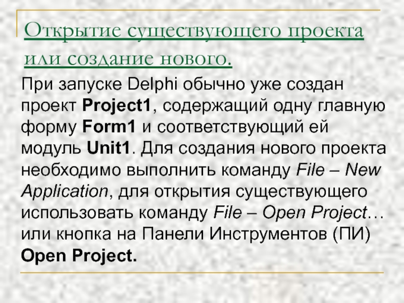 создан проект Project1, содержащий одну главную форму Form1 и соответствующий ей модуль Unit1. Для создания нового проекта необходимо выполнить команду File – New Application, для открытия существующего использовать команду File – Open Project… или кнопка на Панели Инструментов (ПИ) Open Project.