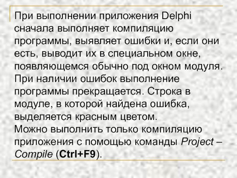 Слайд 35При выполнении приложения Delphi сначала выполняет компиляцию программы, выявляет ошибки и,