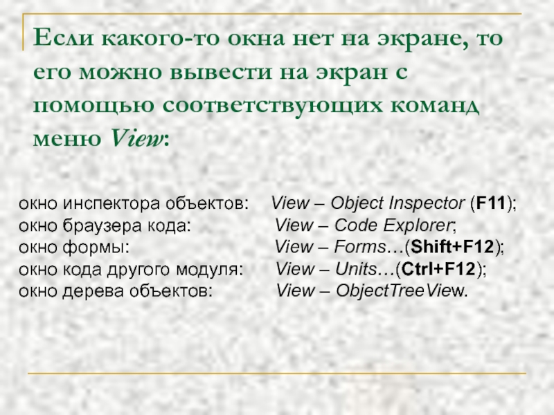 Слайд 25Если какого-то окна нет на экране, то его можно вывести на