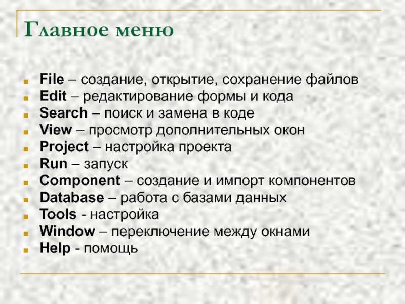Файл главной формы, который по умолчанию называется *.DFM , используется для сохранения информации о внешнем виде главной формы.