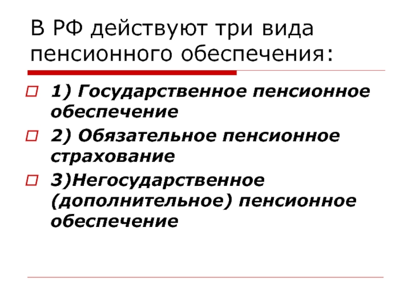 Слайд 20В РФ действуют три вида пенсионного обеспечения:
