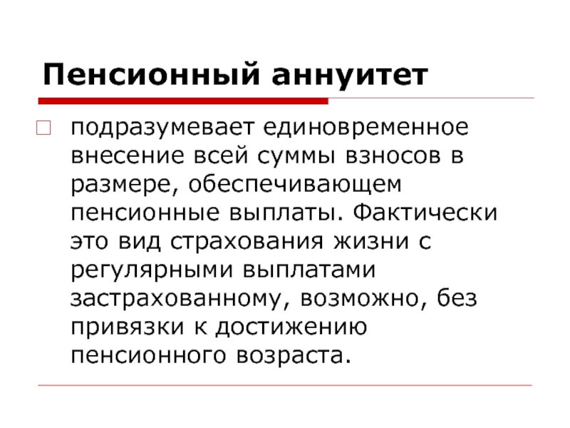 пенсионные выплаты. Фактически это вид страхования жизни с регулярными выплатами застрахованному, возможно, без привязки к достижению пенсионного возраста.